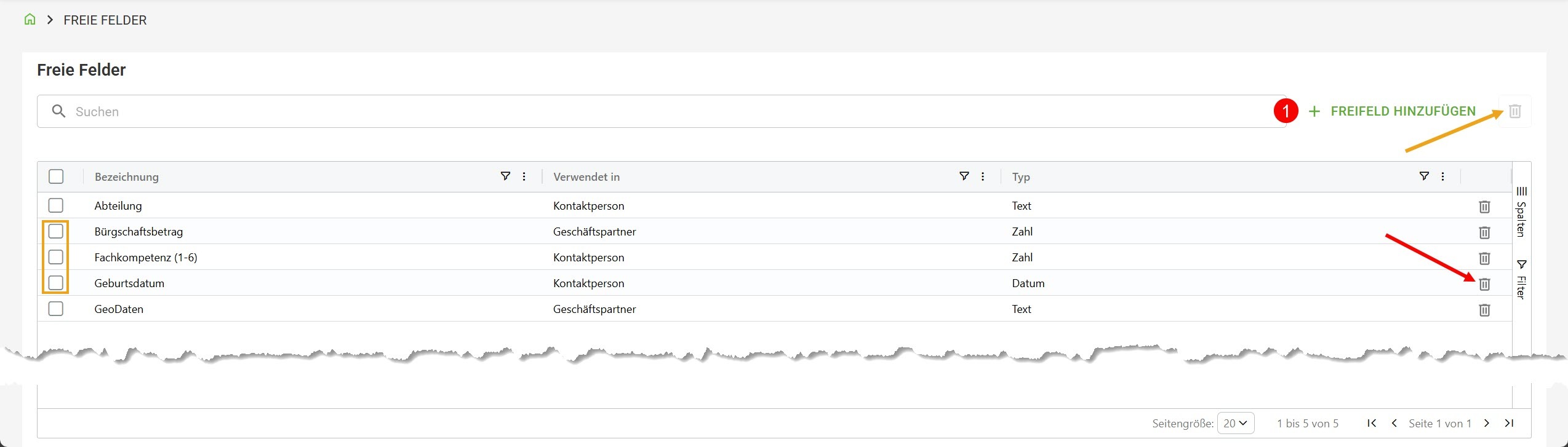 Mehrfaches Löschen ist möglich über das Markieren mehrerer Checkboxen der zu löschenden Freifelder und dem dann aktiven obersten Mülleimer.