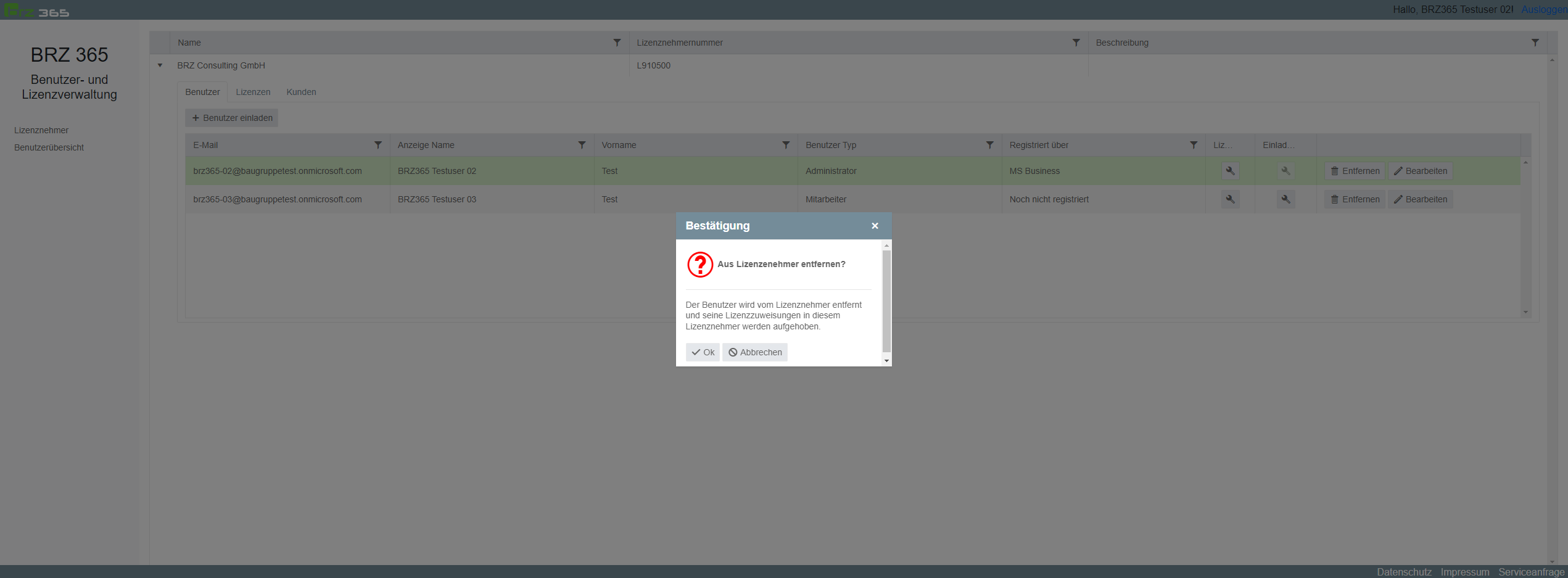 Der Benutzer wird zwar aus ihrem Lizenznehmer entfernt, ist jedoch im BRZ 365 weiterhin registriert. Das bedeutet, falls dieser ihrem Lizenznehmer wieder zugeordnet wird, muss sich der Benutzer nicht erneut registrieren, sondern kann sich sogleich mit seinen bekannten Zugangsdaten anmelden.