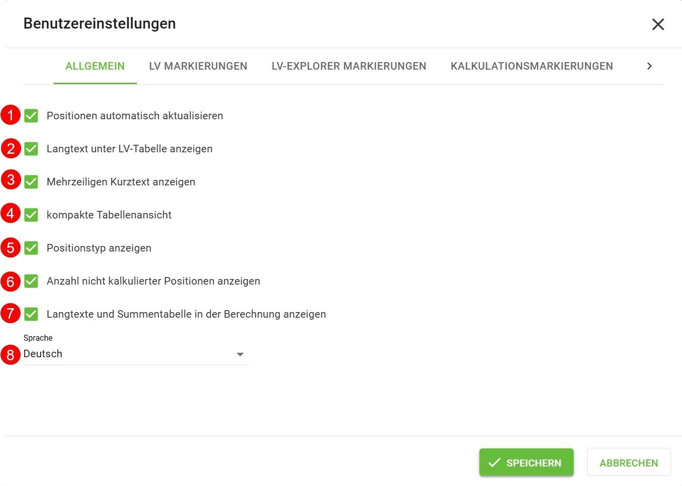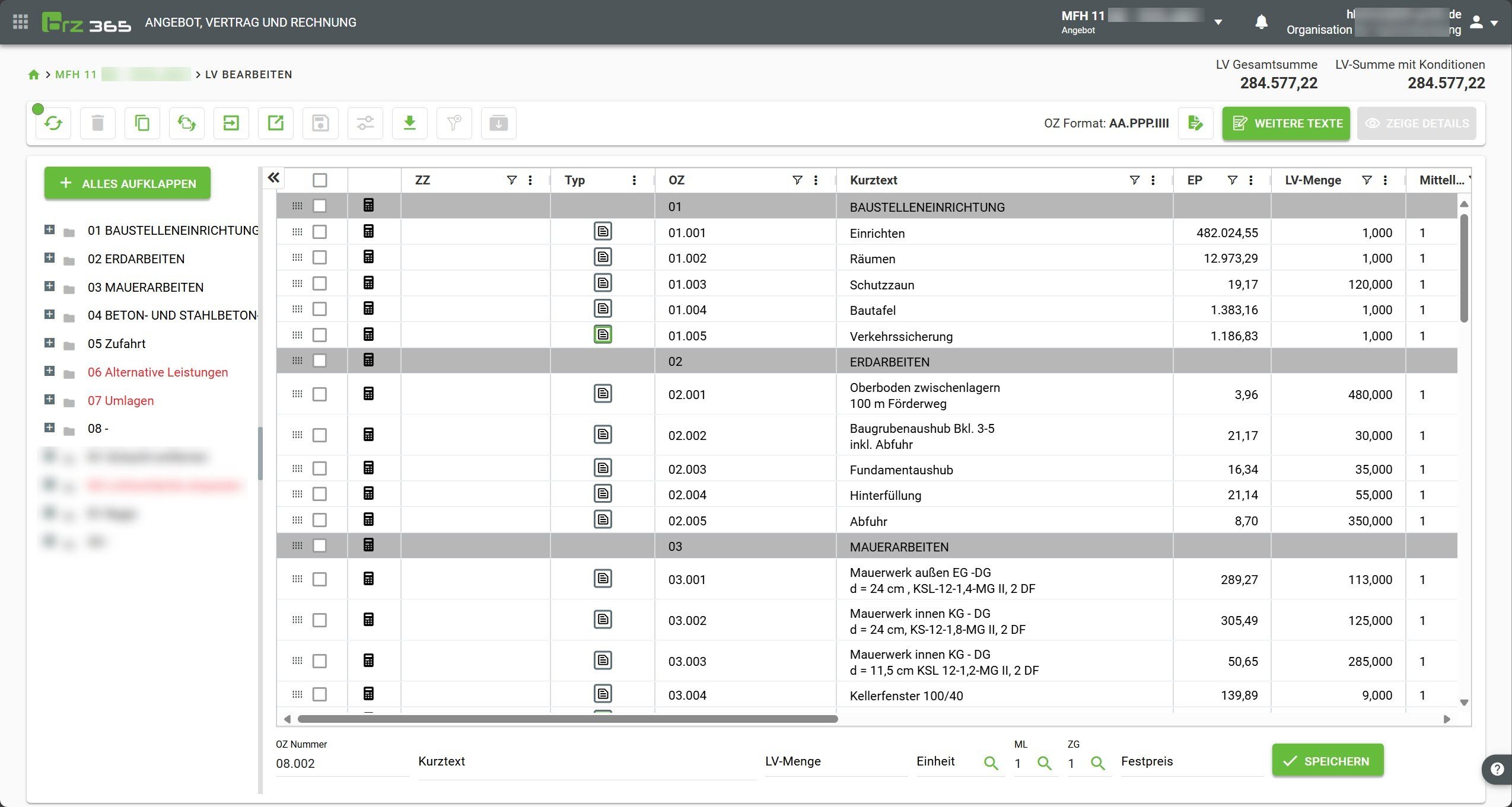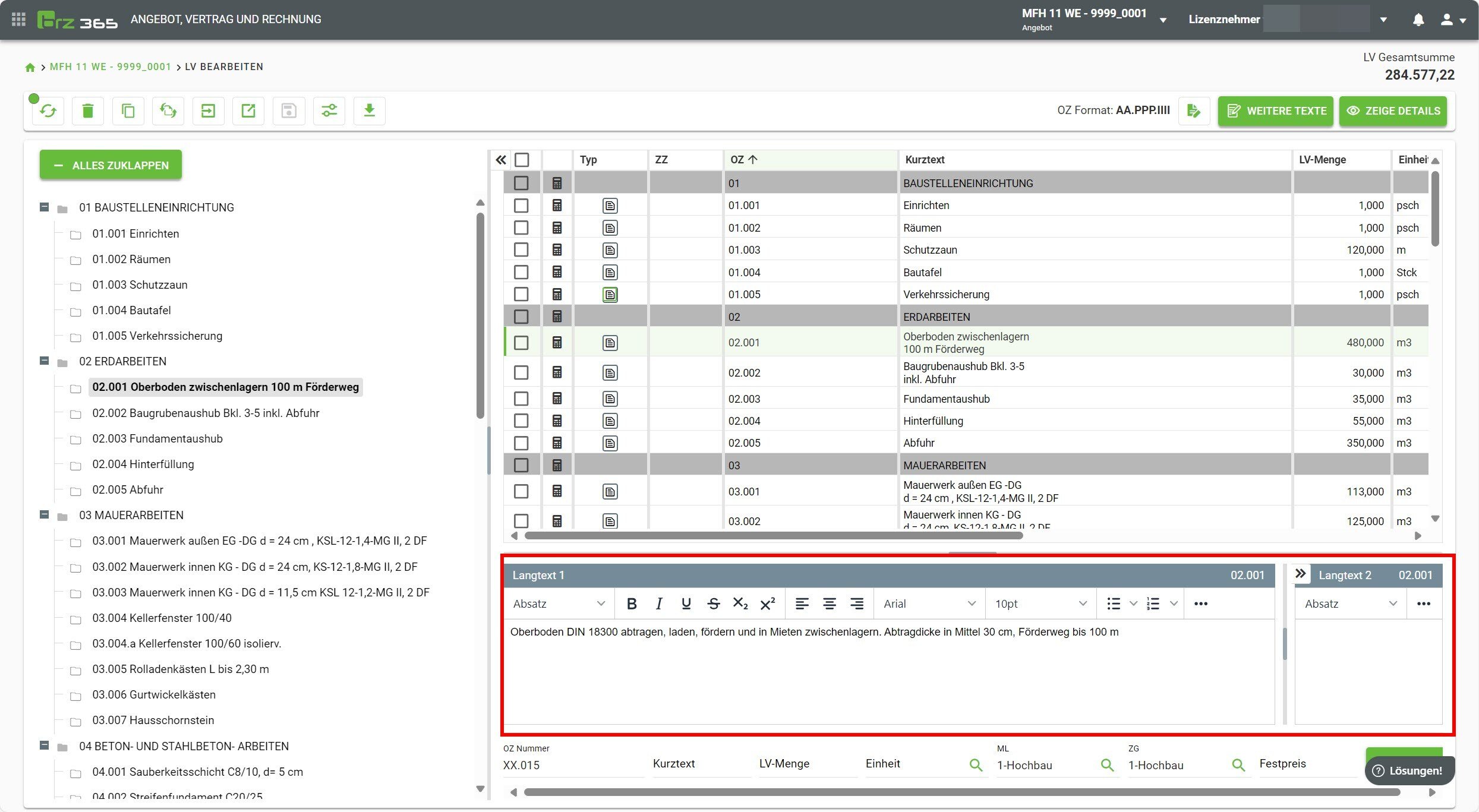 Ist die Checkbox deaktiviert, so werden alle Änderungen sofort gespeichert, das Leistungsverzeichnis sowie die Gesamtsumme werden aber erst nach erneutem durchrechnen aktualisiert.