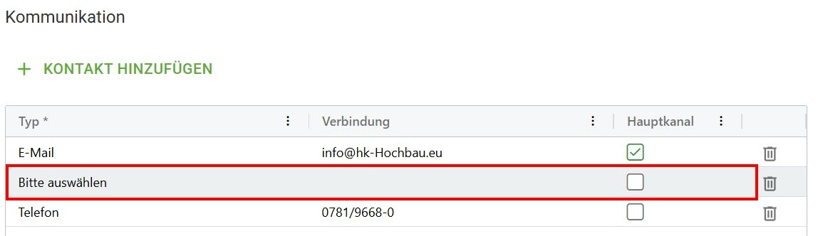 Über Kontakt hinzufügen wird in der Tabelle eine Zeile eingefügt. Erstellen Sie in den jeweiligen Feldern den E-Mail Kontakt, Telefon, Mobil Ihrer Organisation in gültigem Format.