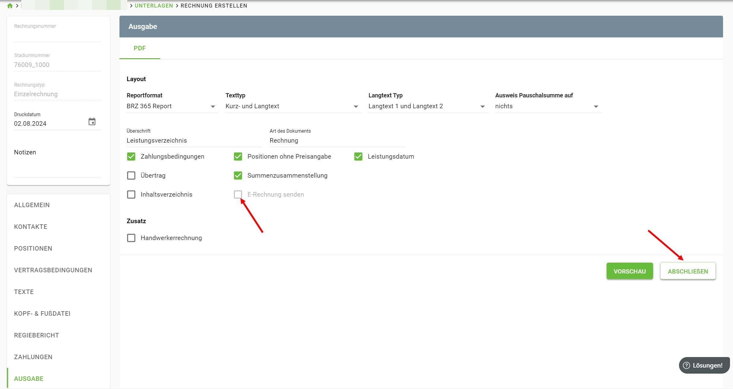 ❌ Achtung: Der Haken E-Rechnung senden wird automatisch gesetzt sobald Sie auf Abschließen klicken.