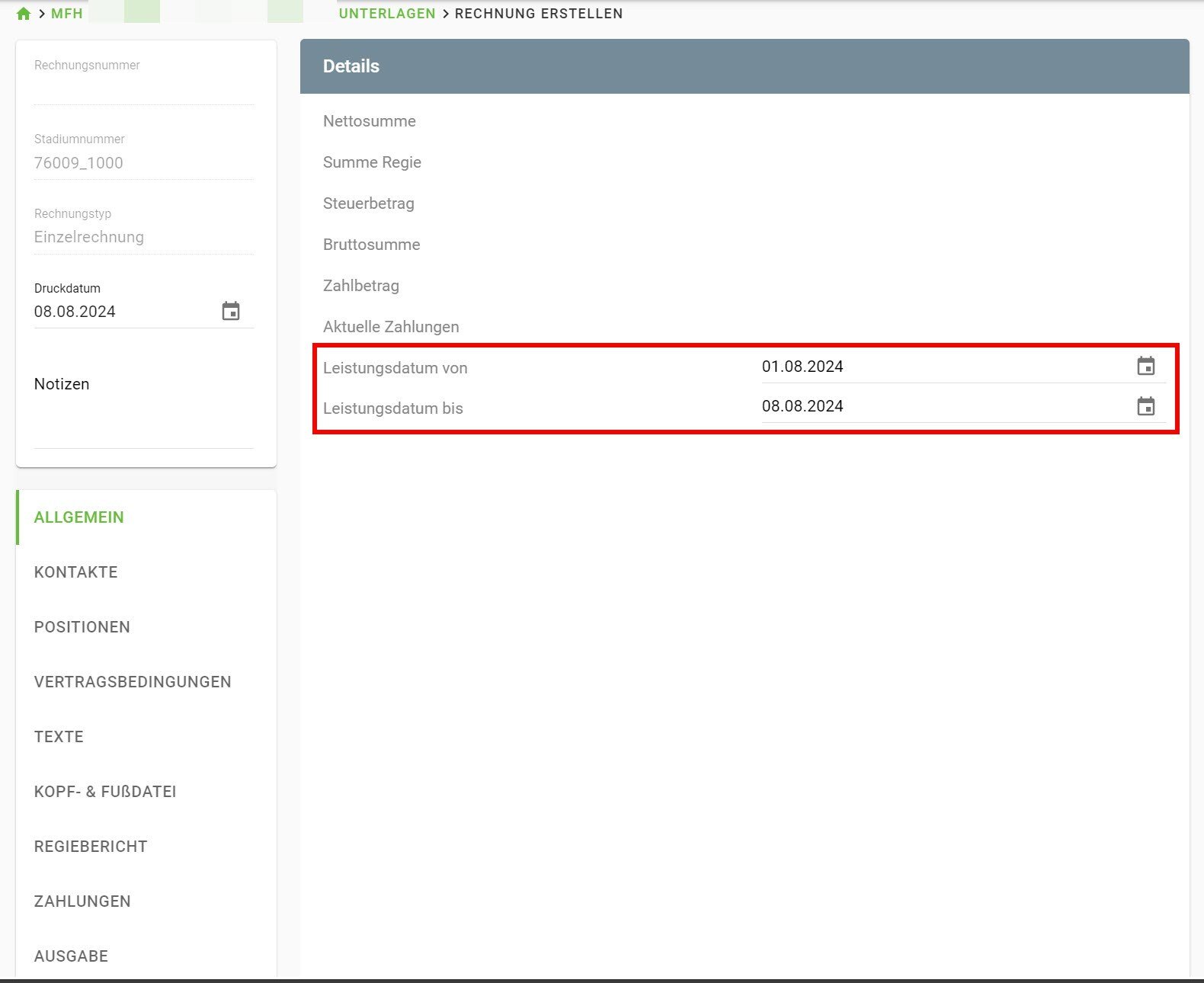 - Auf der Registerkarte Allgemein wird das Leistungsdatum von sowie Leistungsdatum bis benötigt.