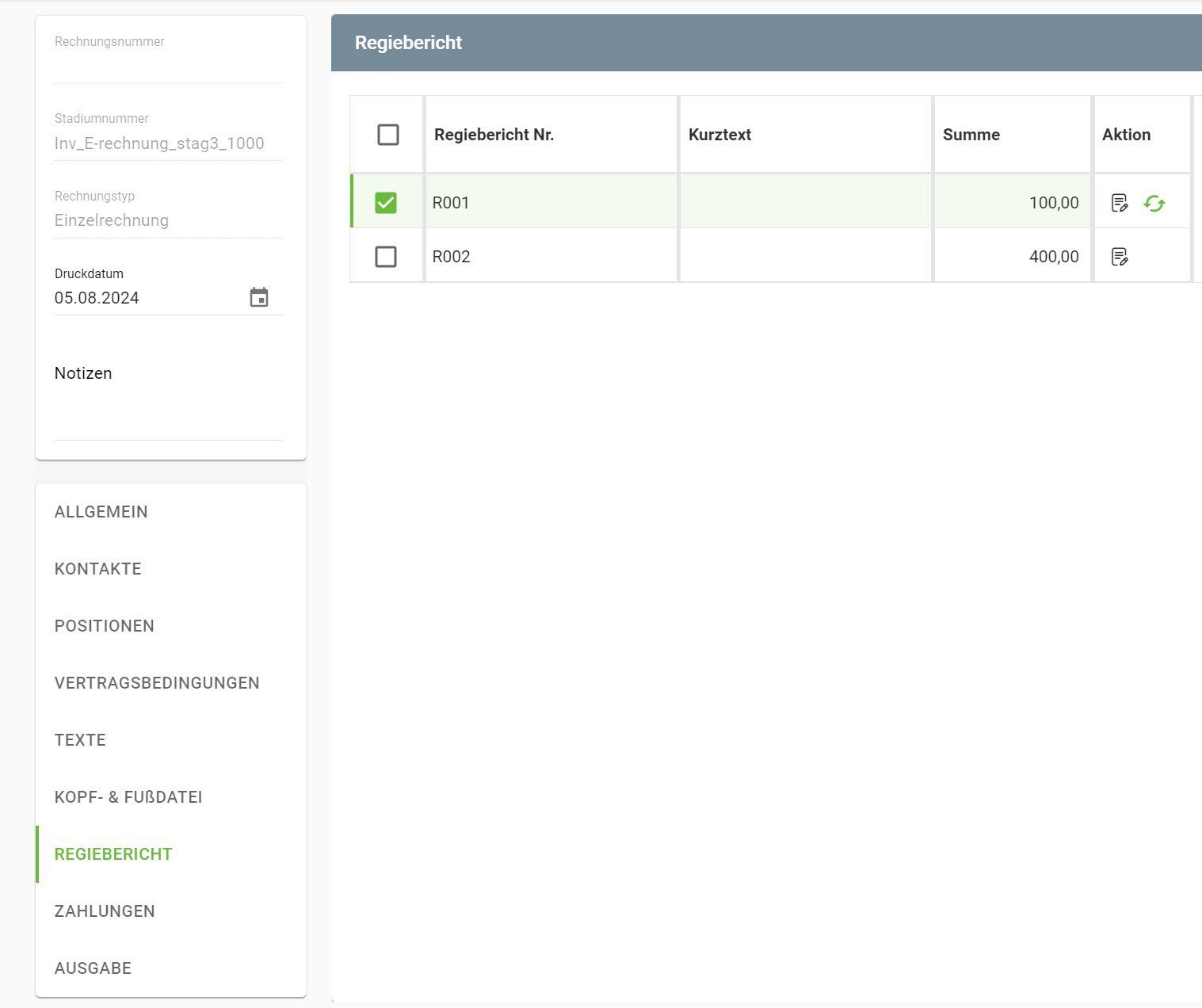 - Auf den Registerkarten Positionen oder Regiebericht können Positionen oder Regieberichte oder beides ausgewählt werden.
