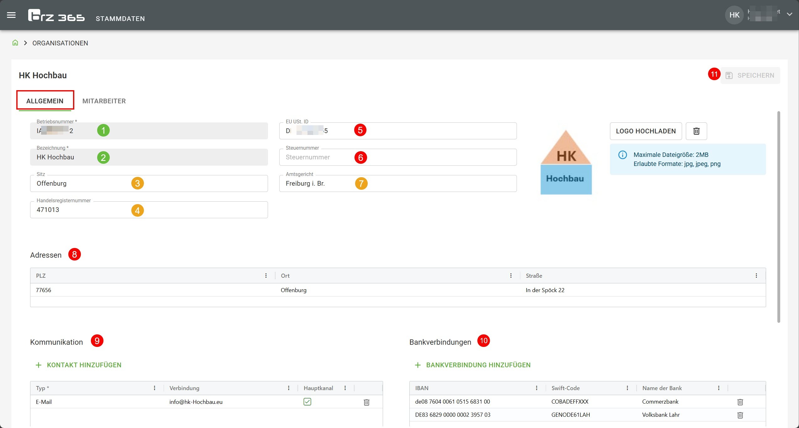 3 Sitz, 4 Handelsregisternummer sowie 5 Amtsgericht sind nicht für den Versand der E-Rechnung zwingend, werden aber in der Regel vom Auftraggeber gefordert, deshalb empfehlen wir alle bekannten Informationen von Beginn an auszufüllen.