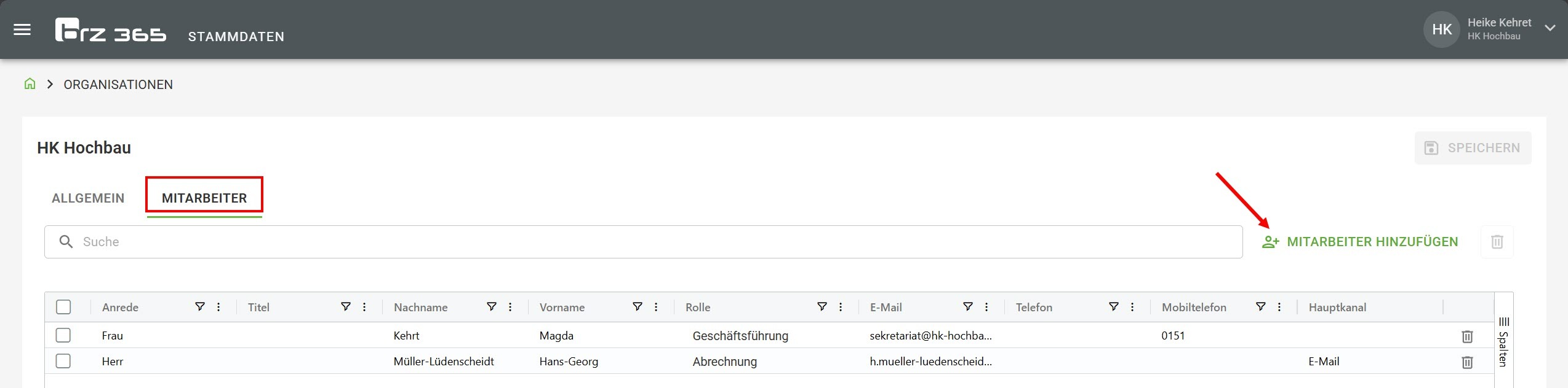 Die Mitarbeiter Ihrer Organisation sollten wählbar und im Anschluss zusammen mit den Kommunikationsdetails vorhanden sein.