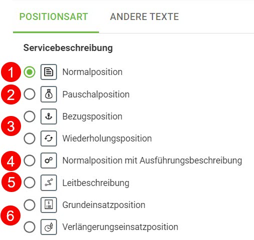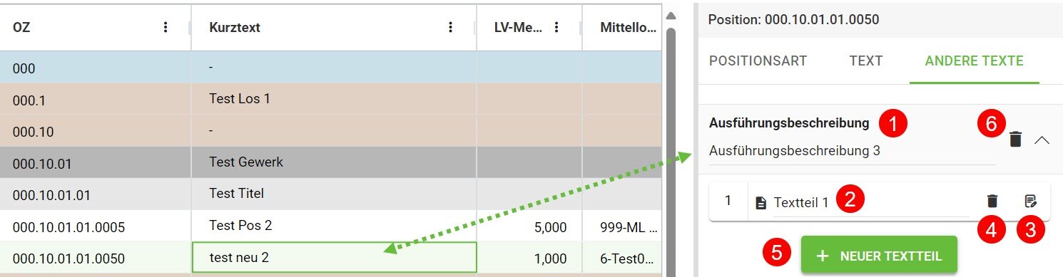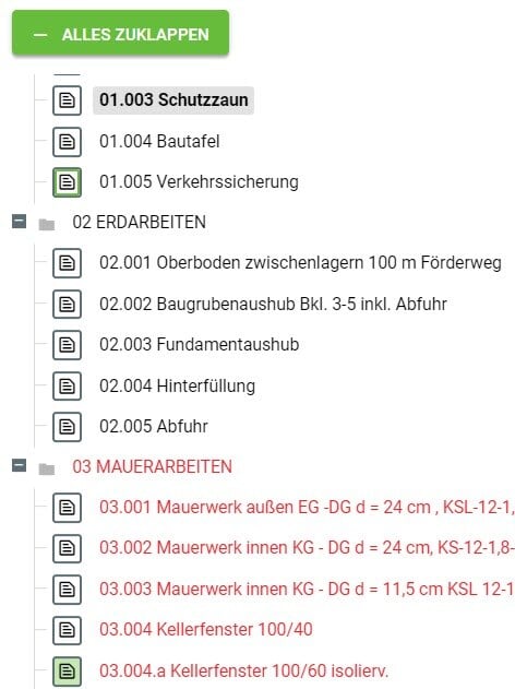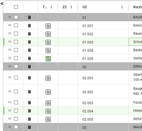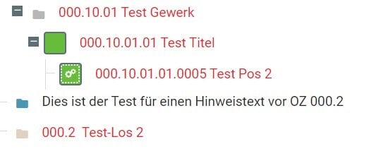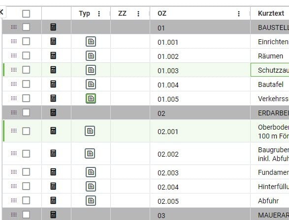 Diese müssen den, mit einer Ordnungszahl versehenen, Teilleistungen (Positionen) vorangestellt werden. Die Positionen erhalten nur noch den ergänzenden Text für die vollständige Beschreibung der Teilleistung.