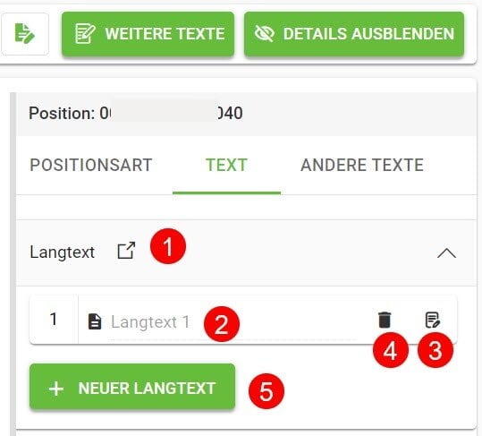 Mit 5 können Langtext 1 und Langtext 2 angelegt werden.