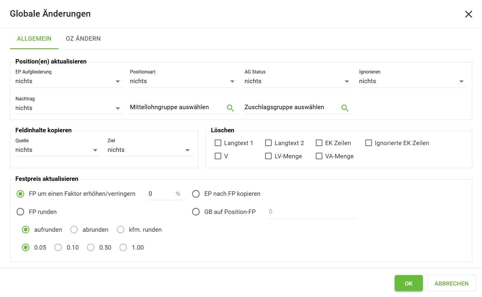 ML und ZG aktualisieren -> Änderung der ML/ZG auf Ebene der Positionen. Darunter liegende ML/ZG der Kalkulation werden nicht geändert.