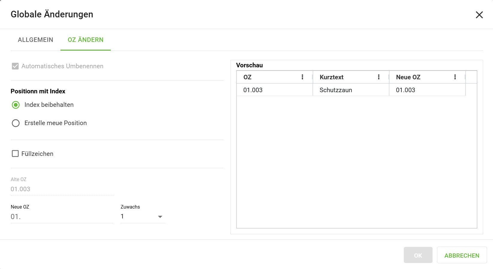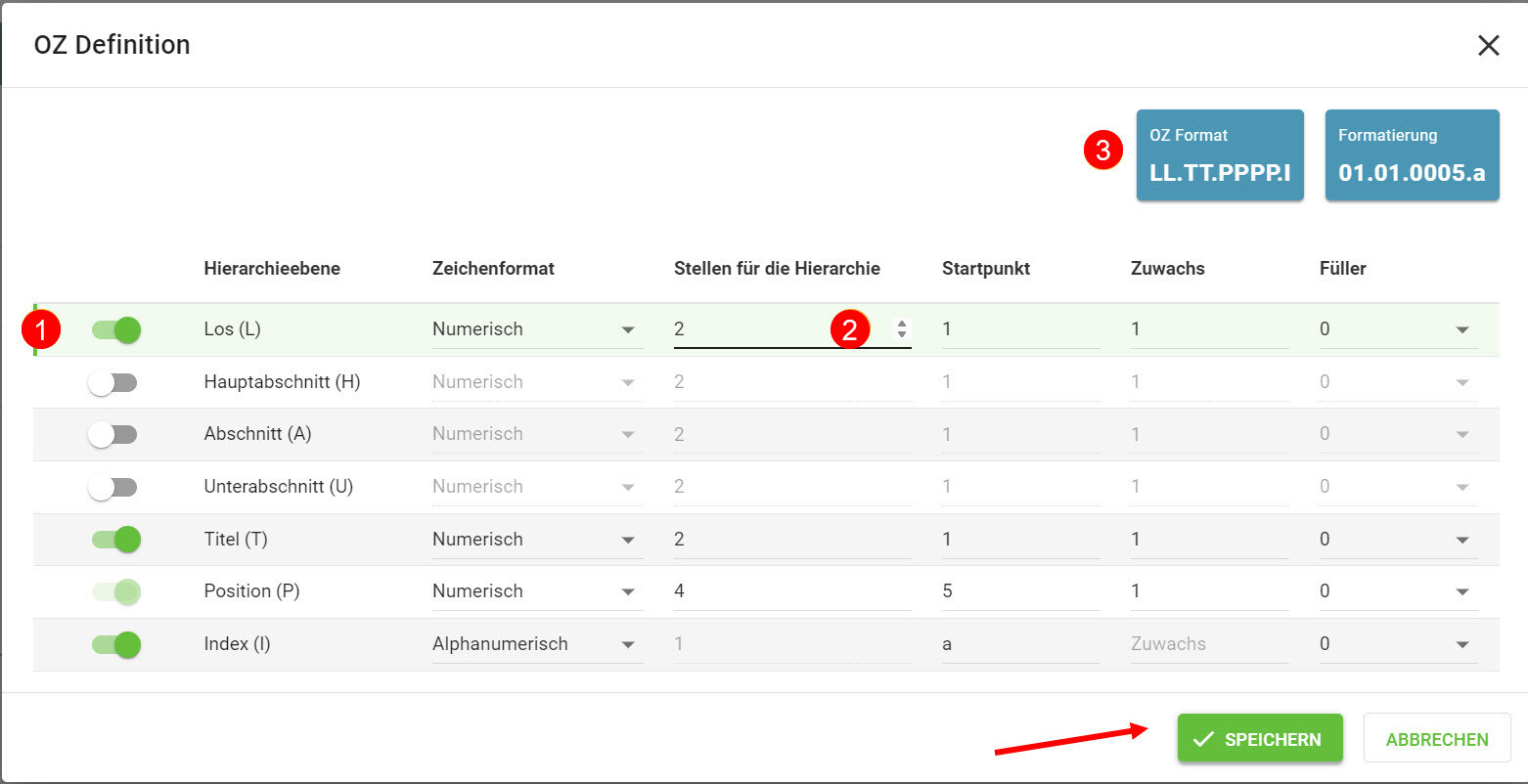 Mit der Eingabe der OZ legen Sie, in Abhängigkeit Ihres OZ Formates, fest ob Sie z.B. Los, Abschnitt, Titel usw. eingeben.