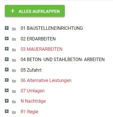Durch Anklicken einer Hierarchiestufe + werden die entsprechenden Unterebenen Zweige dargestellt. Dadurch wird die Suche nach bestimmten Gewerken oder Positionen erleichtert.