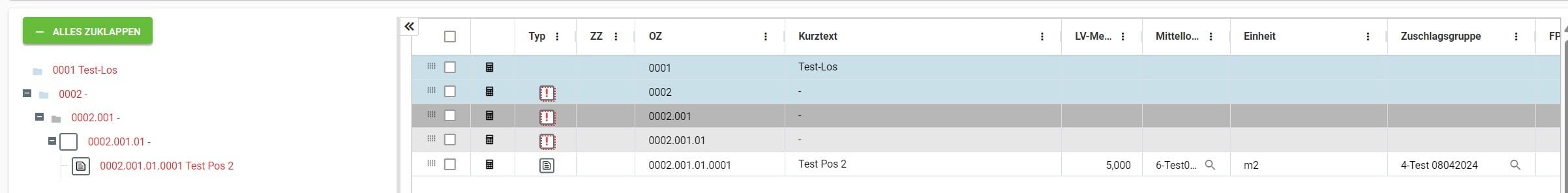 In der Zeile unterhalb der Positionstabelle ist die freie Eingabe von Gliederungspunkten sowie LV Positionen möglich.