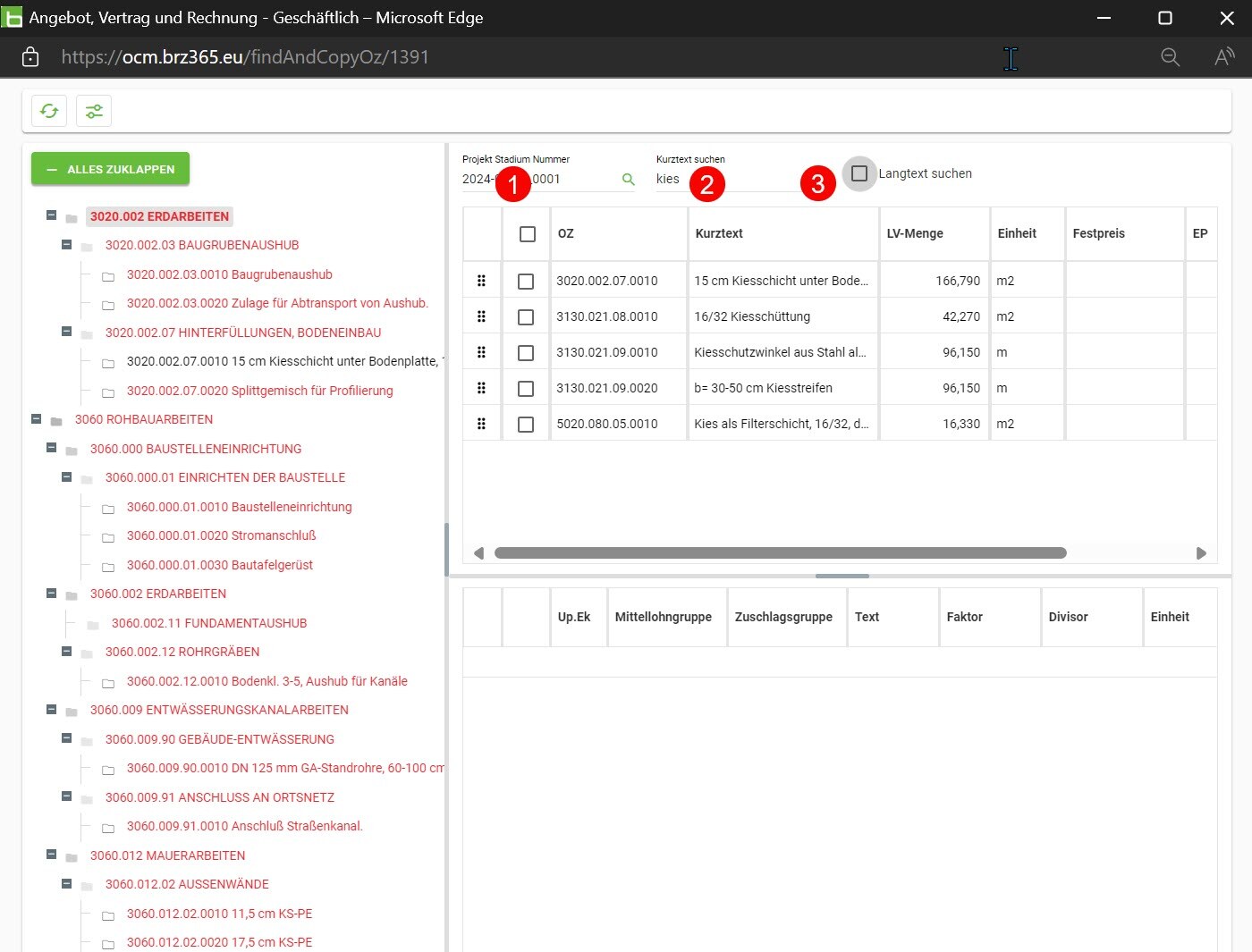 Das Fenster von OZ Suchen und Kopieren ist ähnlich aufgebaut wie das LV-Fenster. Links der LV-Baum, rechts die Positionstabellen mit den Details.