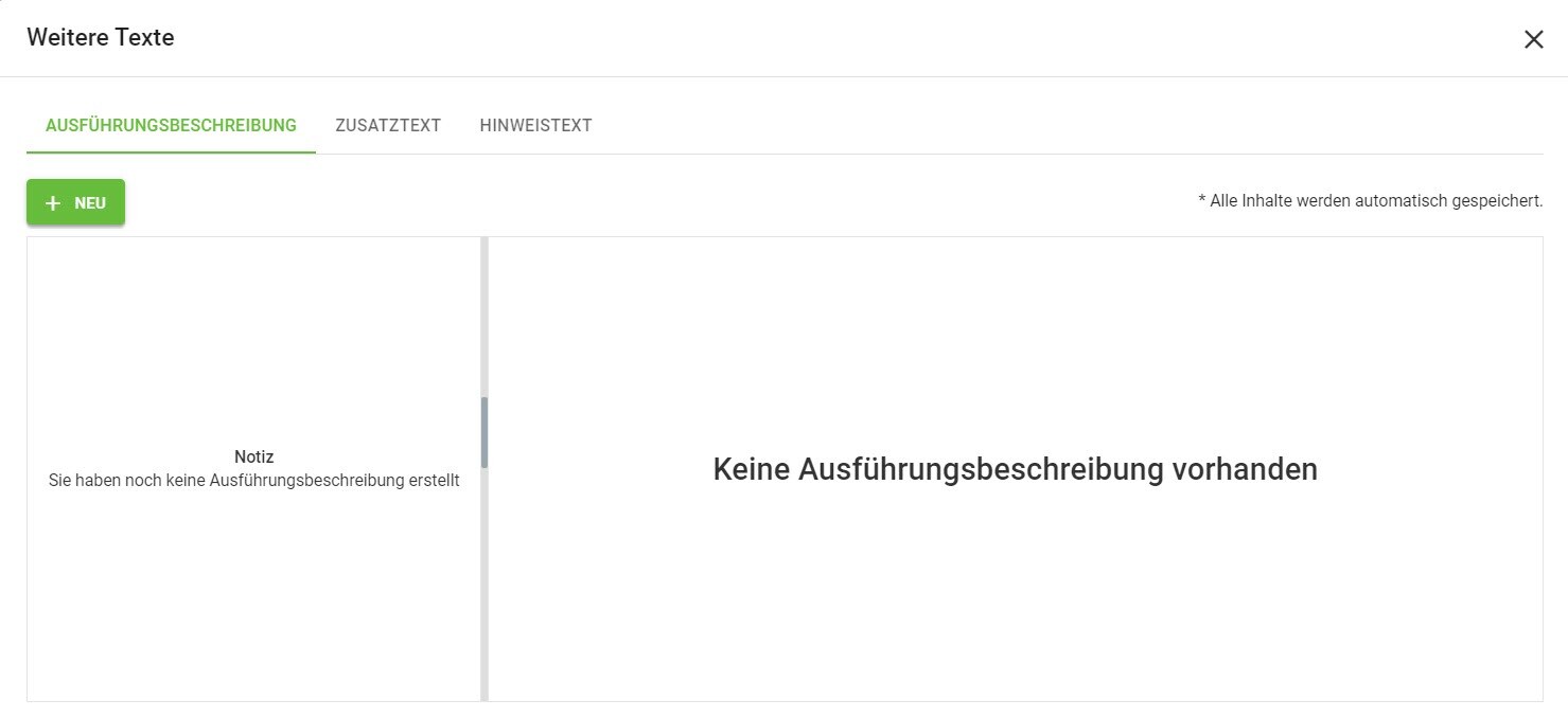 Gleichbleibende, umfangreiche Beschreibungen für eine Reihe von Teilleistungen können unter einer fortlaufenden automatisch generierten Nummer in einer Ausführungsbeschreibung zusammengefasst werden.