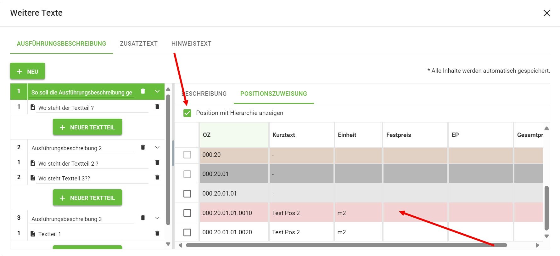 Im Register Positionszuweisung nehmen Sie die Zuordnung zu den Positionen vor, für welche die Ausführungsbeschreibung gelten soll.