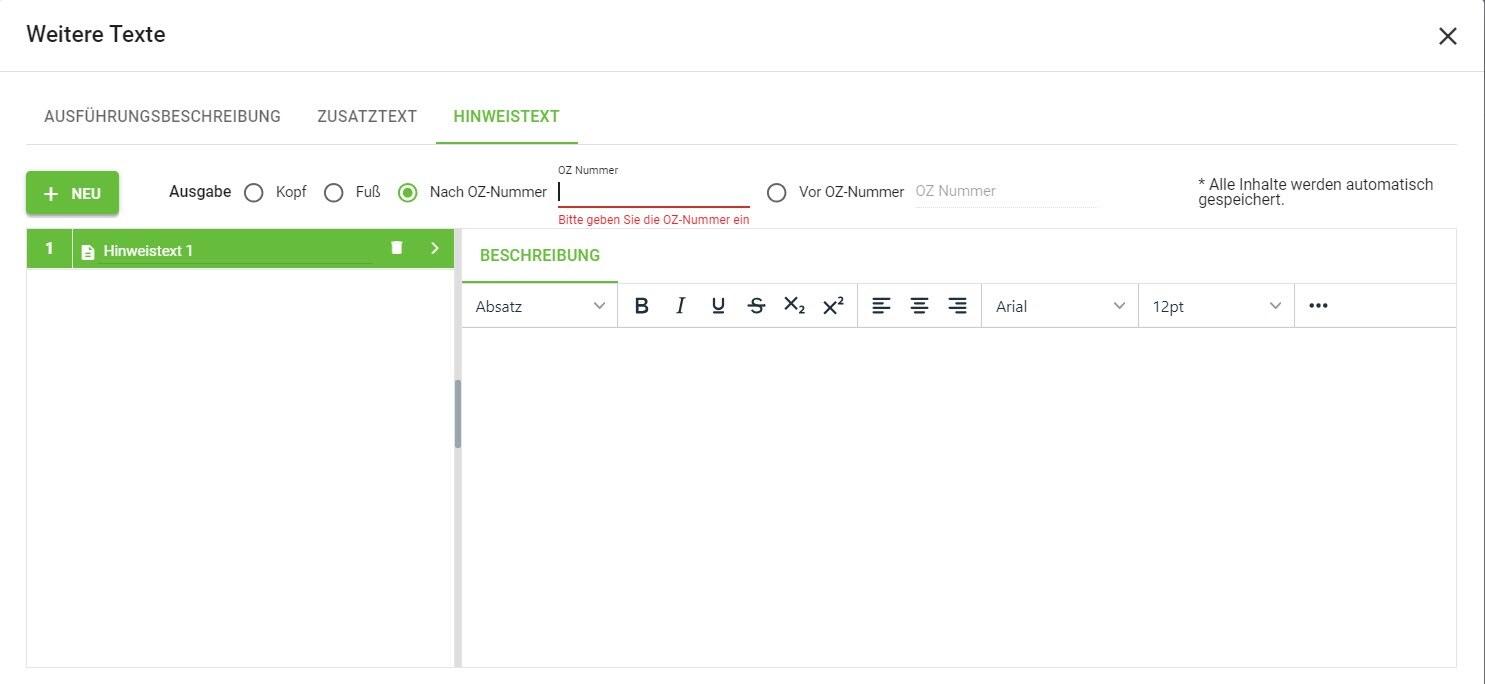 Ebenso ist es möglich den Hinweistext fest mit einer OZ zu verknüpfen in dem Sie diesen Nach oder Vor eine OZ-Nummer setzen.