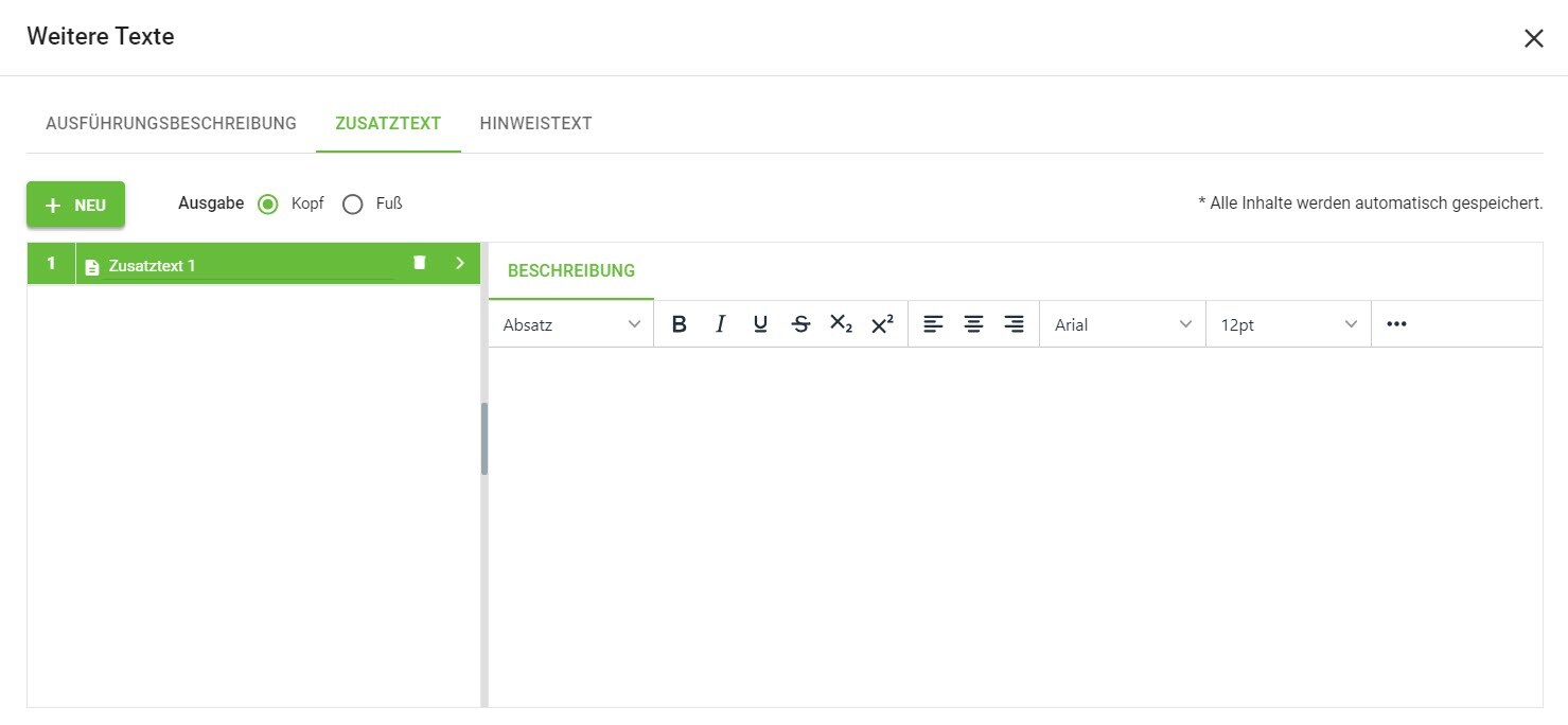 Der Langtext 2 ist eine Erweiterung des Langtext 1. Hier können z.B. bereits NU-Texte, fremdsprachige Texte oder auch Anmerkungen erfasst werden.