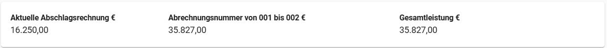 In der Kopfzeile werden die Beträge der aktuellen 10 Abschlagsrechnung € sowie der Betrag der 12 Gesamtleistung € angezeigt. Zusätzlich wird in 11 Abrechnungsnummern von/bis € die Summe von der ersten bis zur aktuellen Abrechnung angezeigt.