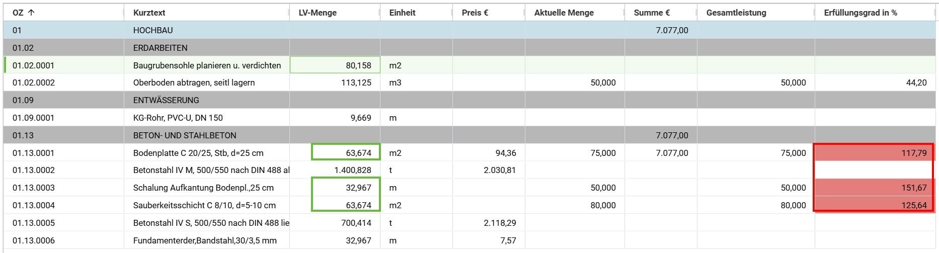 In der Spalte Gesamtleistung 8 werden die Rechnungsmengen der verschiedenen Abrechnungsnummern kumuliert. Gleichzeitig wird die verbleibende Differenz der Gesamtleistung zur LV-Menge bzw. der daraus resultierende 9 Erfüllungsgrad in % ermittelt.
