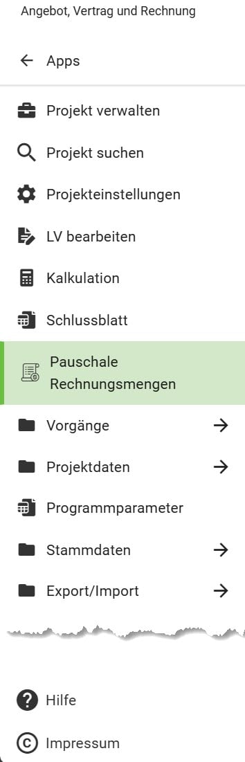 Über die Pauschale Rechnungsmenge können, als Alternative zur Mengenermittlung, Rechnungsmengen z.B. für Abschlagsrechnungen erfasst werden; vorausgesetzt ein Festpreis(FP) ist vorhanden.