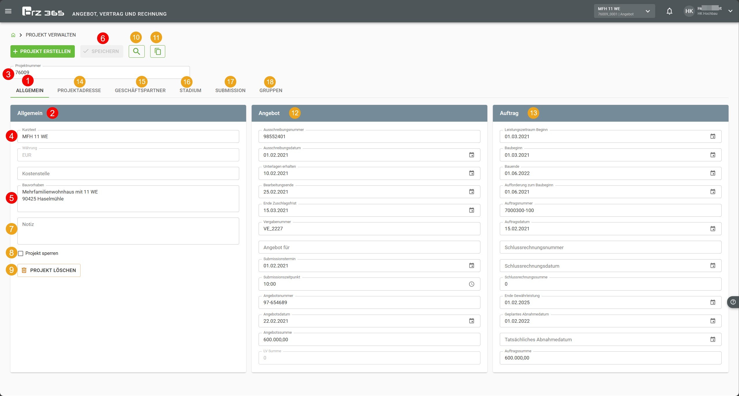 Die Mindestanforderungen für die Erstellung eines neuen Projektes sind auf der Registerkarte 1 Allgemein im Bereich 2 Allgemein einzutragen, diese sind: