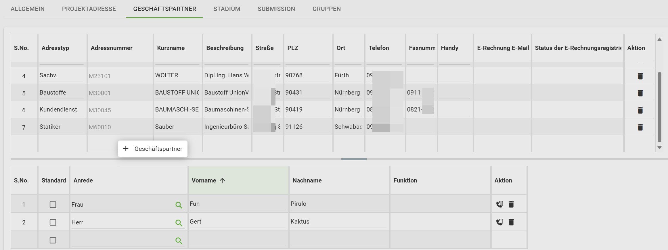 Unter der Registerkarte Geschäftspartner können Fremd-Firmen mit den jeweiligen Ansprechpartnern hinterlegt werden.