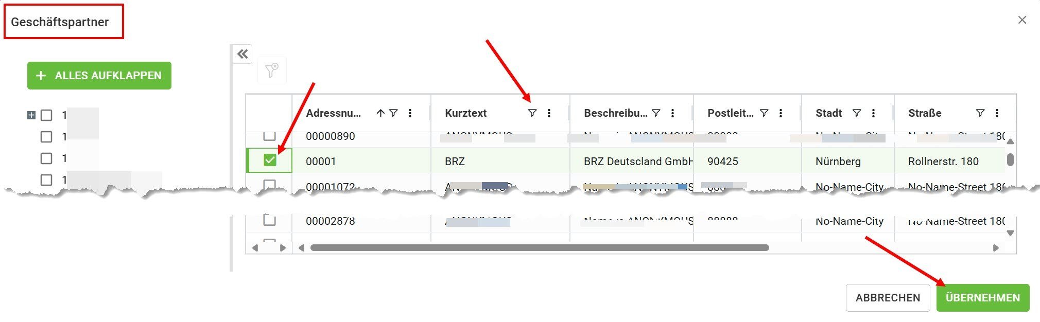 Mit rechtsklick in das leere Feld Adressnummer können Sie die Geschäftspartner aus Ihrem Firmenstamm über die Checkbox anwählen und übernehmen.