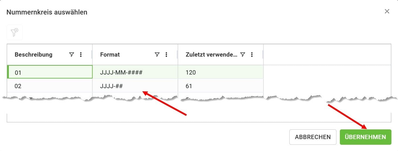 Wählen Sie einen Ihrer in der Stammdaten-APP erstellten Nummernkreise...