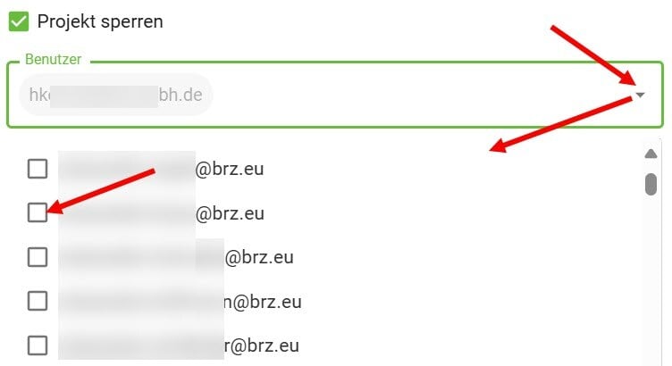 Wenn Sie den Haken bei Projekt/Stadium sperren setzen, öffnet sich eine Liste aller angelegten Mitarbeiter, aus der Sie eine beliebige Anzahl von Benutzern per Checkbox anwählen können, die weiterhin Zugriff auf das Projekt haben werden.
