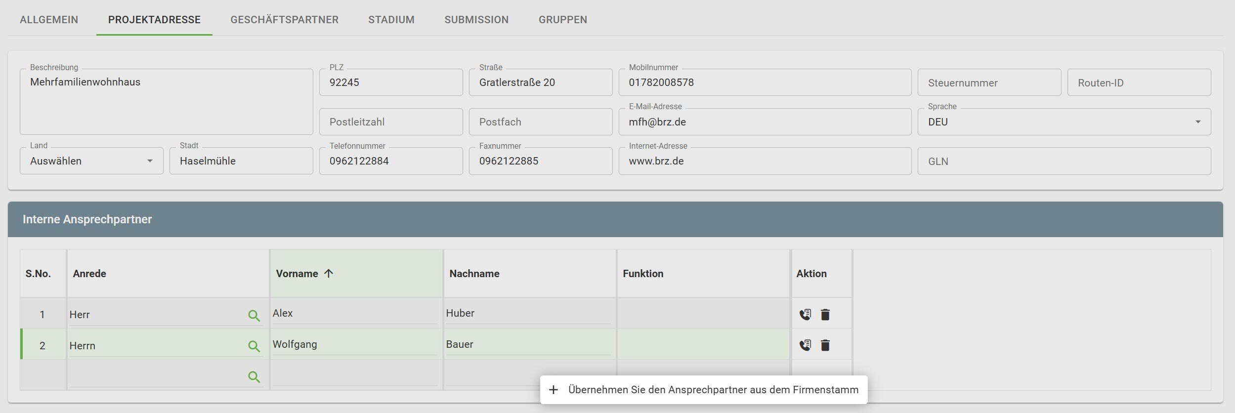 Daneben besteht die Möglichkeit Adressen und Ansprechpartner manuell zu erfassen, welche dann nur im aktuellen Projekt zur Verfügung stehen.