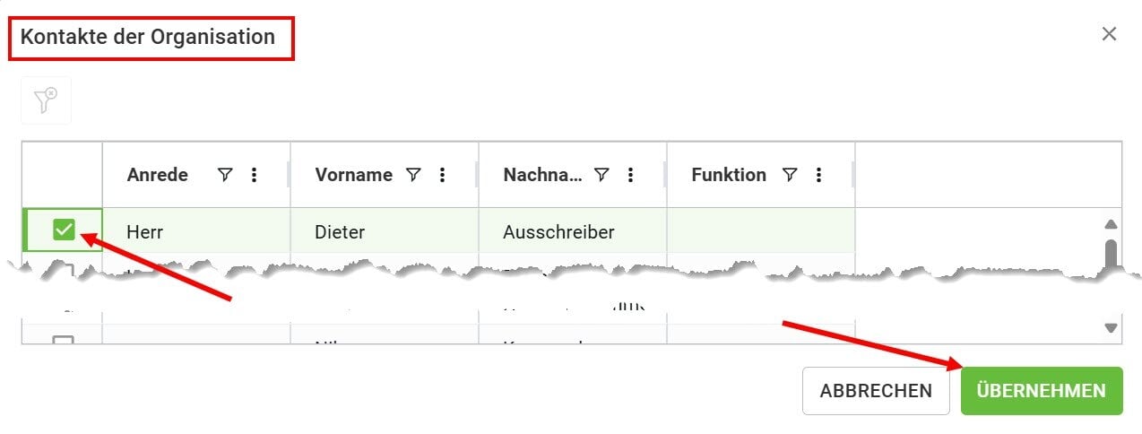 Mit rechtsklick in eine der Tabellen-Zeilen können Sie die Ansprechpartner aus Ihrem Firmenstamm über die Checkbox anwählen und übernehmen.