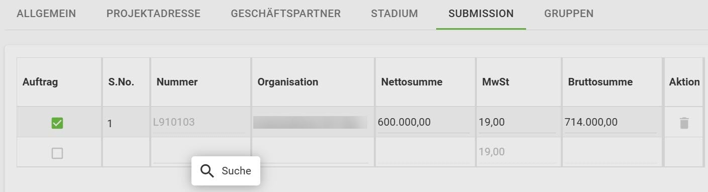 Sobald die Angebotsbearbeitung abgeschlossen ist, kann über die Auftragsübernahme ein neues Stadium Auftrag erstellt werden.