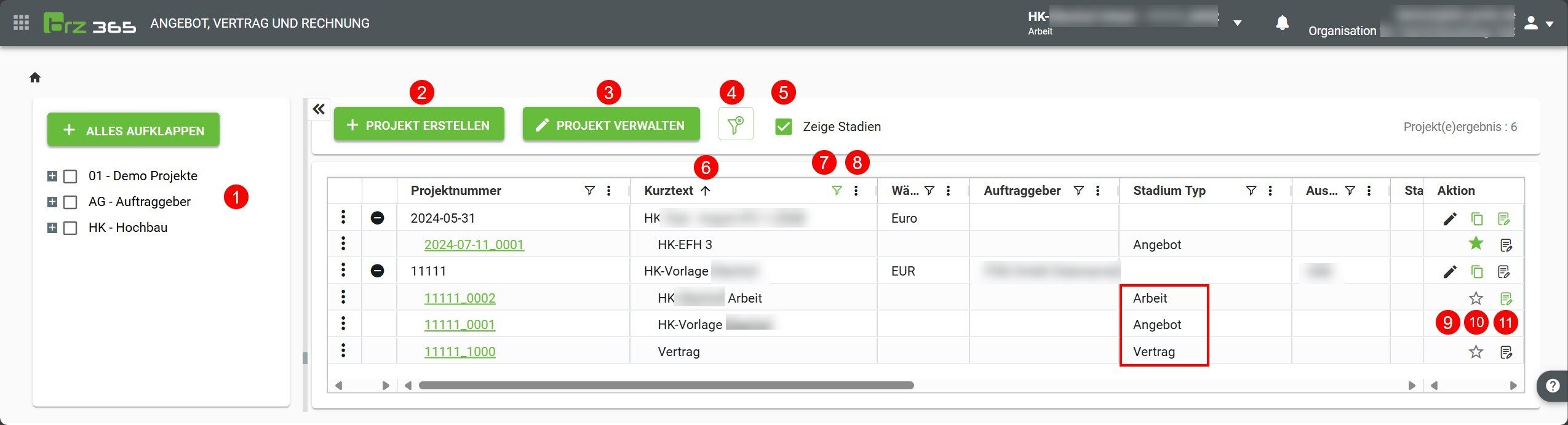 Mit dem Haken in der Checkbox 5 werden die Projekte in der Tabelle aufgeklappt um direkt alle Stadien zu sehen. Der Stadium-Typ ist in der entsprechenden Spalte beschrieben.