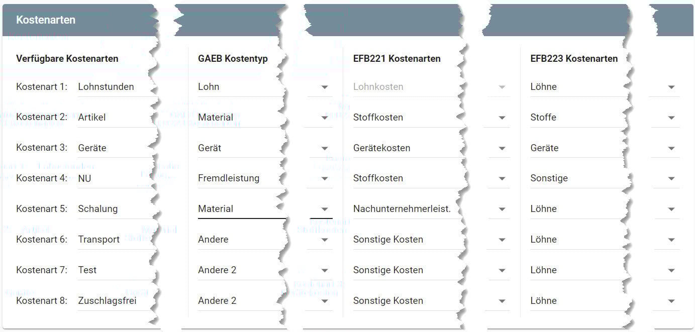 Unter Verfügbare Kostenarten können Sie die Bezeichnung der Haupt-Kostenarten für die Kalkulation (Kalkulationsspalten) ändern.