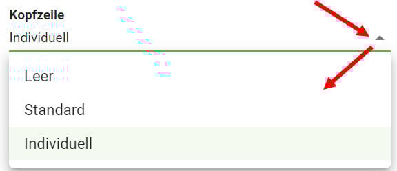 Individuell: Haben Sie im Stamm für Kopf- und Fußbereich entsprechende Vorlagen für Ihre Organisation hinterlegt, können Sie diese über die Suche auswählen.