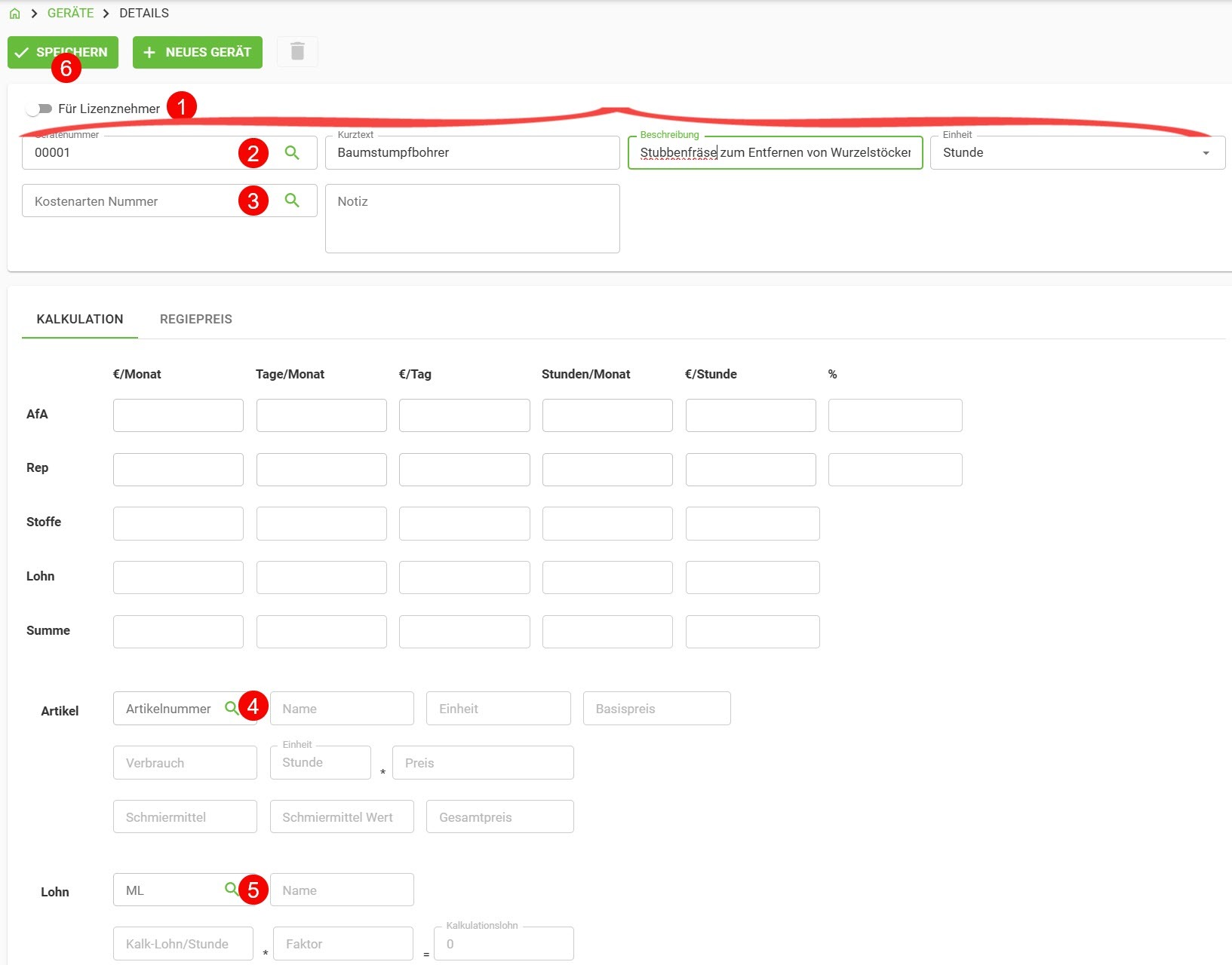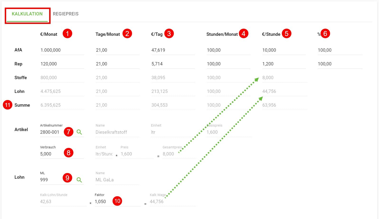 Abruf eines Artikels 7 (i.d.R. Diesel). Darunter geben Sie den Verbrauch des Gerätes pro Stunde 8 ein.