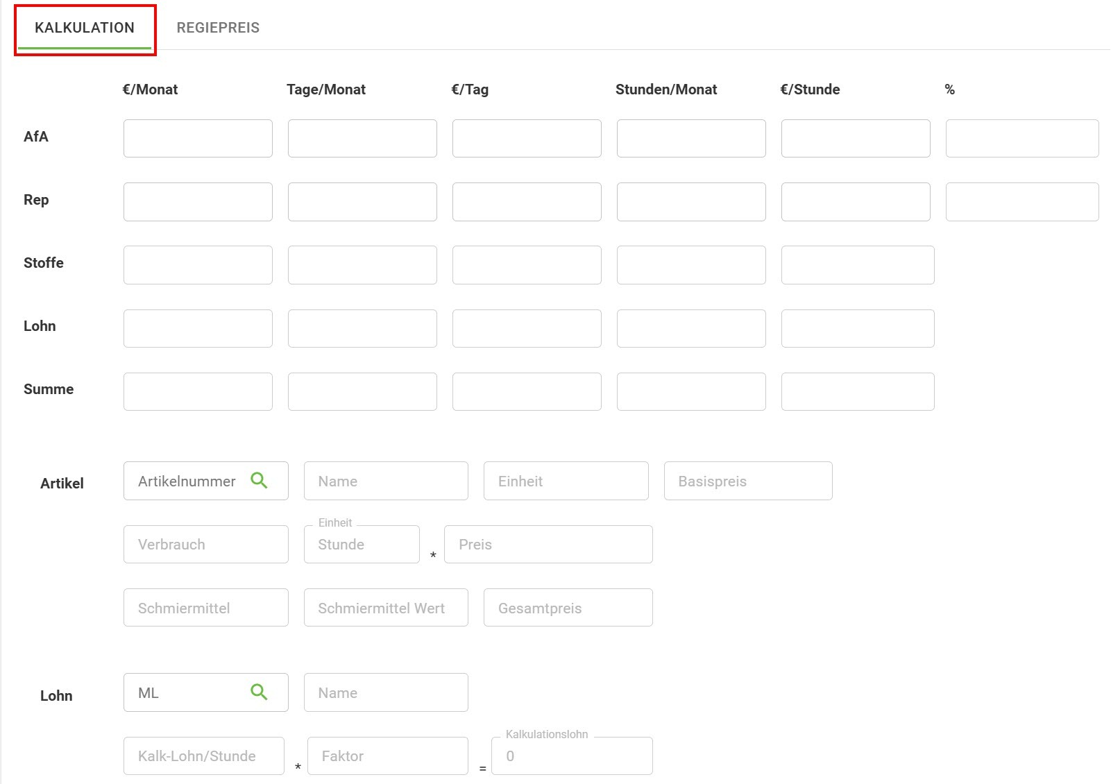 Das Programm berechnet die Werte aus Artikel sowie Lohn und übernimmt diese in die obere Berechnung.