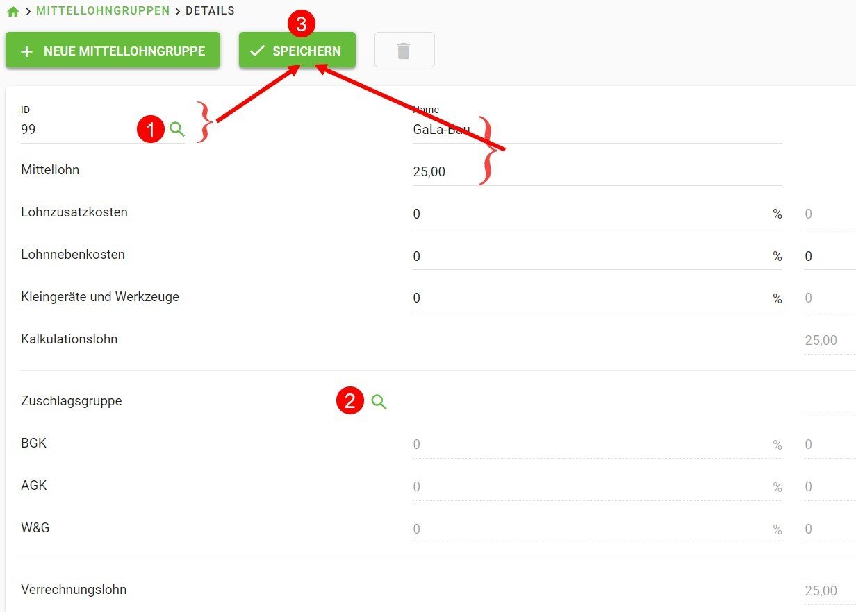Abruf einer Mittellohngruppe 10. Daneben können Sie einen Faktor eingeben 11 , um evtl. Wartungszeiten pro Einsatzstunden vorzugeben (z.B. 1,05).