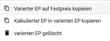 Nach Öffnen der Variantenkalkulation übernehmen Sie als erstes die kalkulierten EP’s in die variierten EP’s (Kontextmenü ).