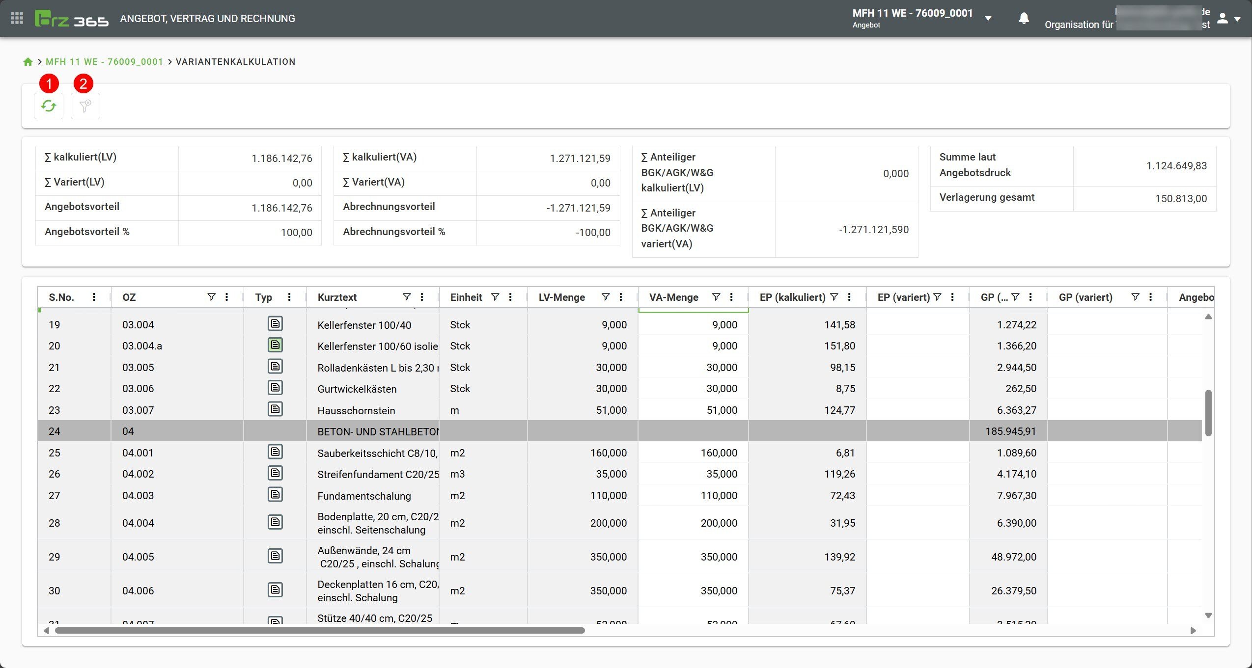 ∑ variiert (VA) - Hier erscheint die variierte VA-Summe. Sie entsteht durch Aufsummierung der von Ihnen eingegebenen variierten Einheitspreise jeweils multipliziert mit der VA-Menge.