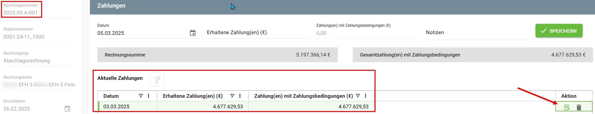 Nach dem Speichern wird/werden alle Zahlungen zur ausgewählten Rechnung im Bereich Aktuelle Zahlungen angezeigt.
