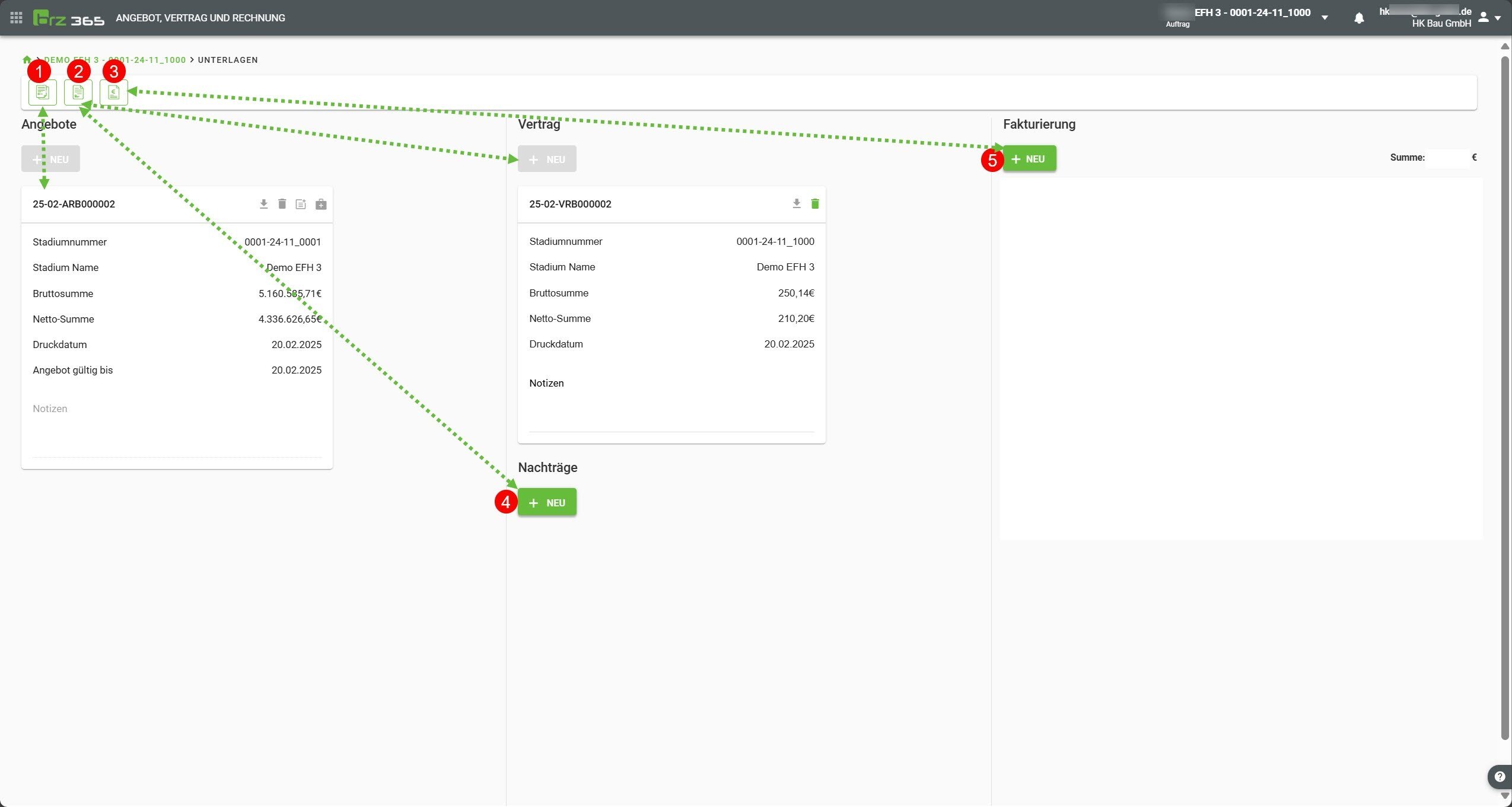 Aus einem fertigen Vertragsstadium heraus ist es nur noch möglich neue Nachträge 4 sowie Rechnungen 5 zu erstellen.