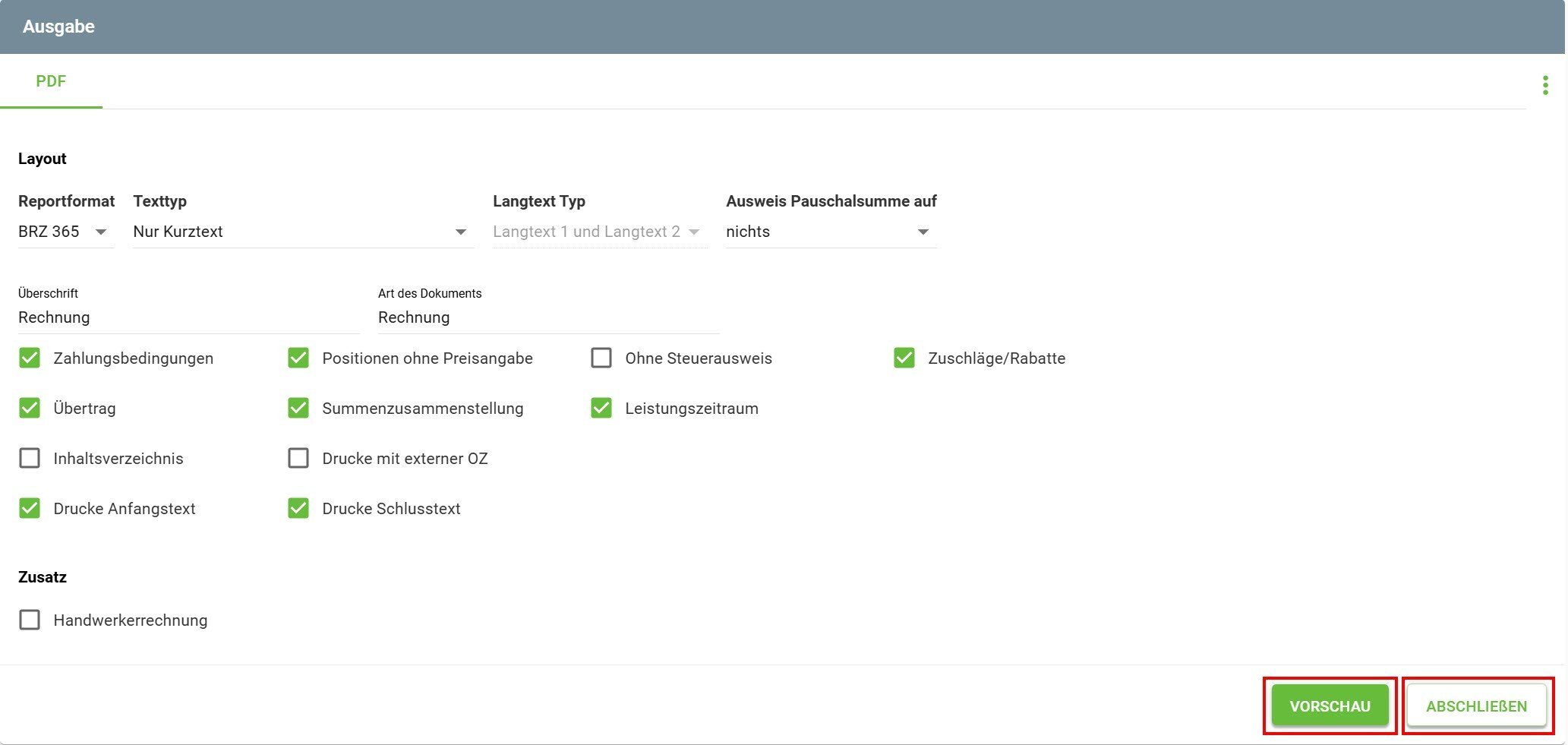 Um die Daten und den Andruck der gewählten Einstellungen der künftigen Rechnung zu prüfen klicken Sie auf die Vorschau, somit wird eine PDF erzeugt.