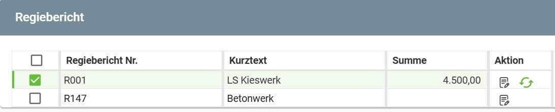Sollen neben der Standard LV Abrechnung auch noch Regieberichte in einer Rechnung mit angedruckt werden, so erfolgt die Auswahl der Berichte hier mittels Checkbox