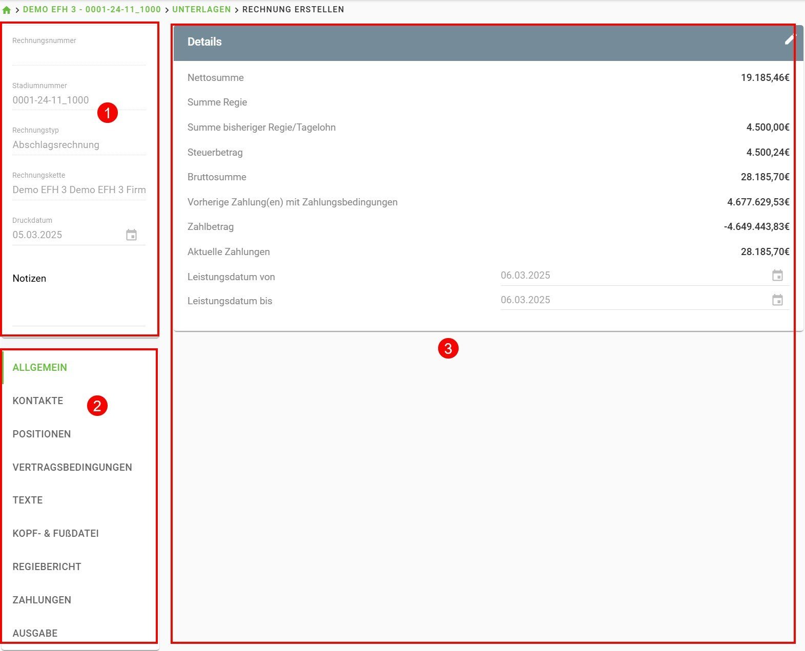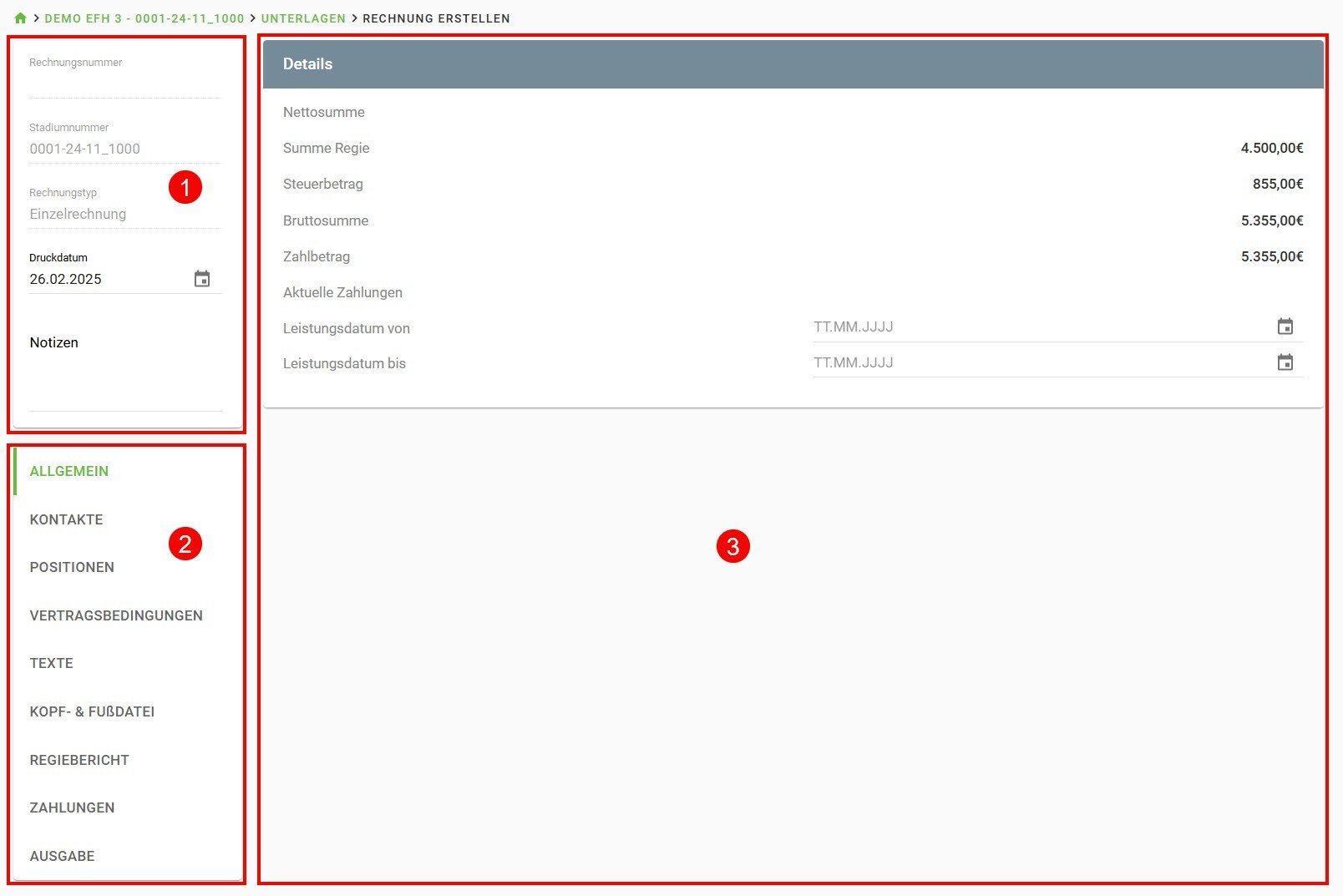 2 Unten links befinde sich die Registerkarten Allgemein, Kontakte, Positionen, Vertragsbedingungen, Texte, Kopf- & Fußdatei, Regiebericht, Zahlungen sowie Ausgabe