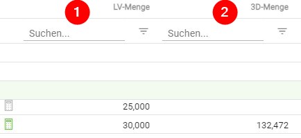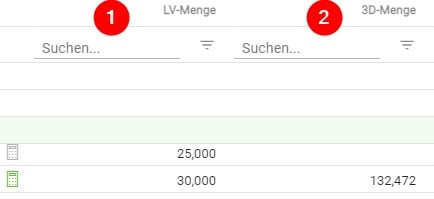 Sollten in AVR bereits Mengen im Leistungsverzeichnis enthalten sein, sind diese in Spalte 1 LV-Menge aufgeführt. Sobald eine LV-Position mit einem Bauteil verknüpft ist, wird die aus der IFC ermittelte Menge (Summe) in Spalte 2 3D-Menge aufgeführt.