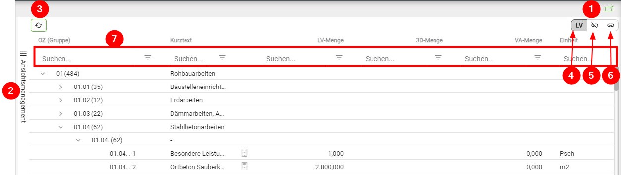 Mit 4 bis 6 ist die Sichtbarkeit der Positionen steuerbar. 4 Das ganze LV ist sichtbar. 5 Nur die LV-Positionen ohne Verknüpfung zu einem Bauteil sind sichtbar. 6 Nur die LV-Positionen die mit mind. einem Bauteil verknüpft sind, sind sichtbar.