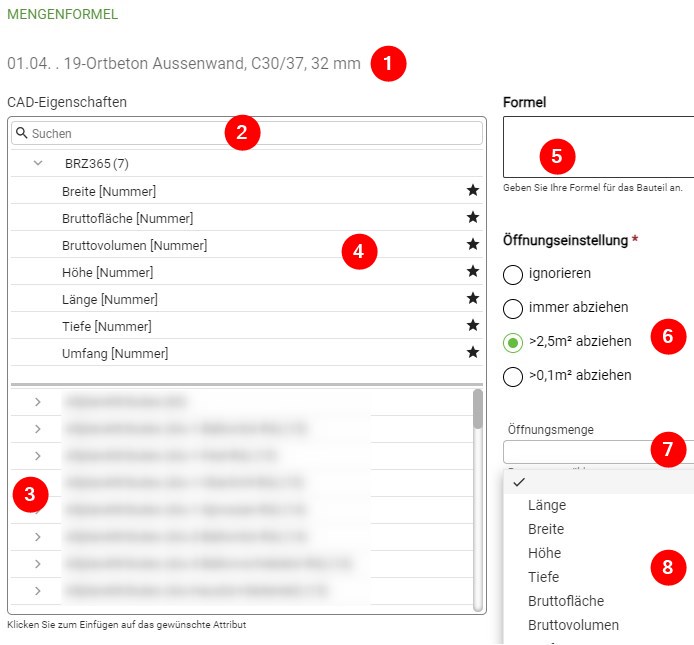 Sollen für die zu errechnenden Mengen, Abzüge für Öffnungen berücksichtigt werden, müssen diese über die Öffnungseinstellung 6 freigeschalten werden. Die Öffnungsmenge kann nach klick in das Feld 7 aus der dann erscheinenden Auswahl 8 gewählt werden.