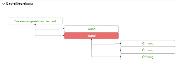 ⏩ Beispiel: In diesem Fall ist erkennbar, dass diese Wand gleichzeitig "Kind-" und "Elternelement" ist. Sie ist eine von zwei Schichten eines mehrschichtigen Bauteiles, die wiederum drei "Kinder"-Öffnungen beinhaltet.