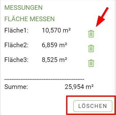 Die gemessenen Strecken und Flächen können einzeln über den Mülleimer oder gemeinsam über Löschen gelöscht werden.